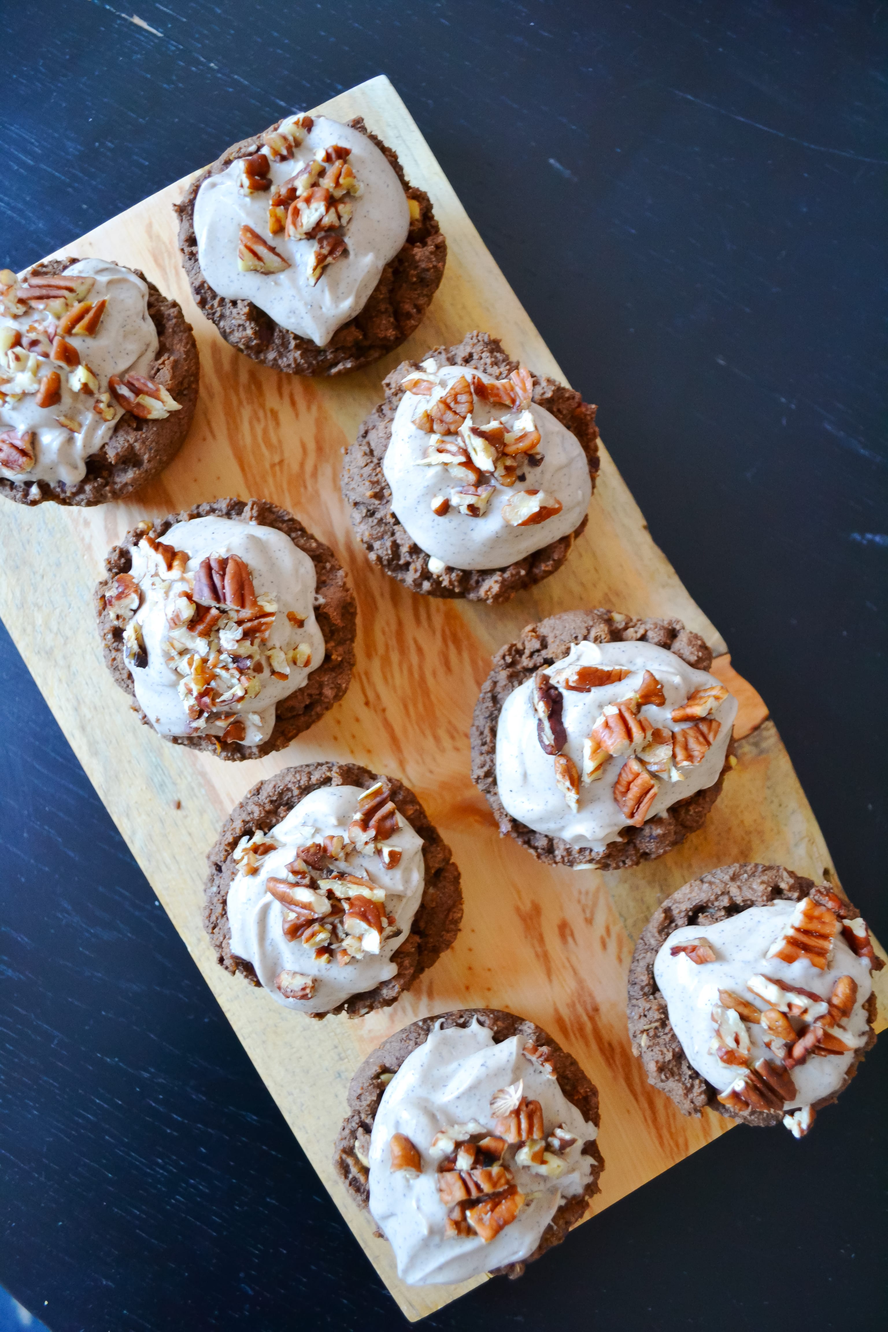 Fill a silicone muffin pan with the mixture and bake for 25 to 30 minutes. Whilst the muffins are baking combine all of the frosting ingredients in a food processor and mix until smooth.