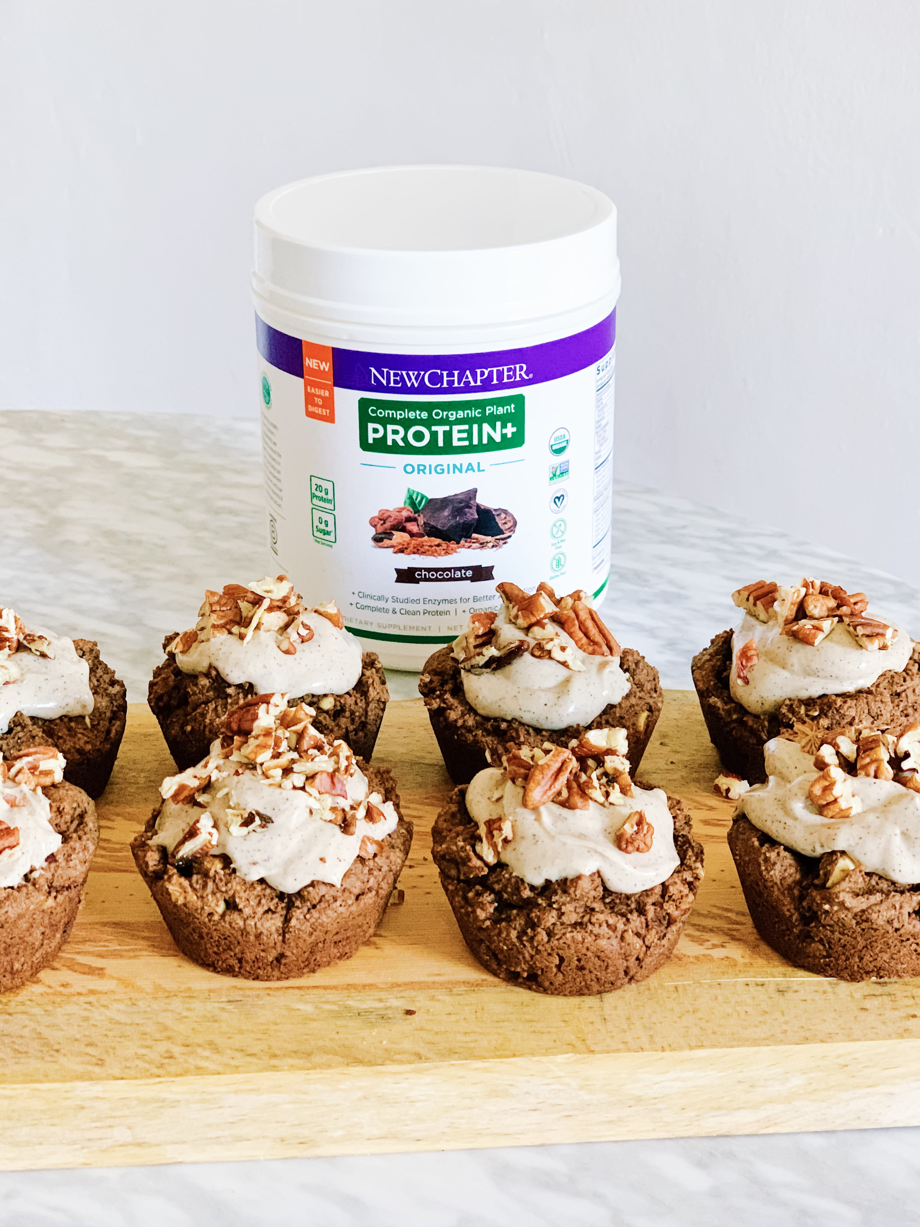 I wanted to recreate that flavour and texture combination, but to keep it gluten-free, dairy-free, sugar-free, low carb and suitable for my Lean and Clean Program. New Chapter’s Complete Organic Plant Protein+ has become my go-to ingredient for healthy baking – each serving provides 20g of easily digestible plant protein, blends mung bean and brown rice proteins with hemp and chia seeds for a complete amino acid profile, and even contains clinically studied digestive enzymes to prevent bloating and ensure you absorb all that valuable protein!